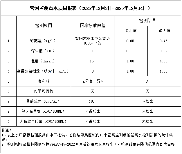 管網(wǎng)監(jiān)測點(diǎn)水質(zhì)周報表(2025年12月8日-2025年12月14日)