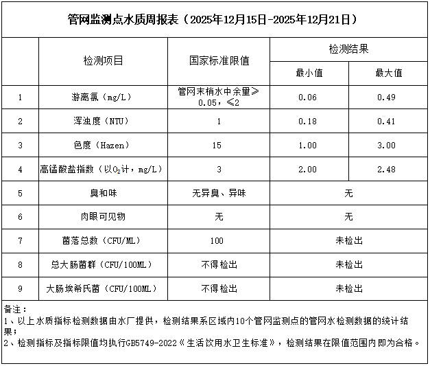 管網(wǎng)監(jiān)測點(diǎn)水質(zhì)周報(bào)表(2025年12月15日-2025年12月21日)