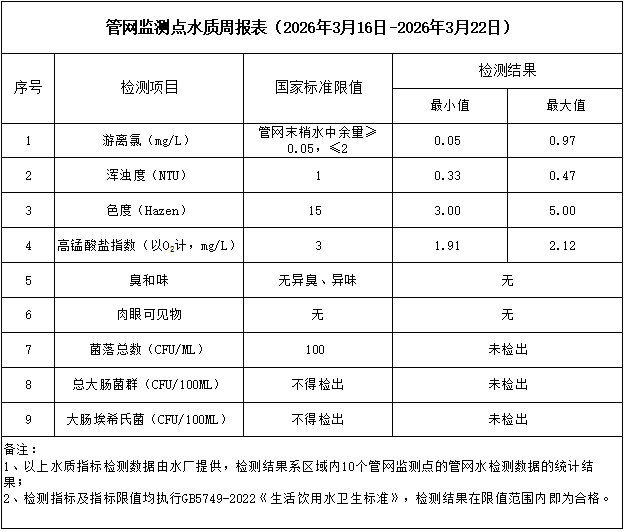 管網(wǎng)監(jiān)測點(diǎn)水質(zhì)周報(bào)表(2026年3月16日-2026年3月22日)