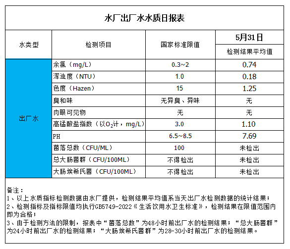 水廠出廠水水質(zhì)日報表(2023-5-31)