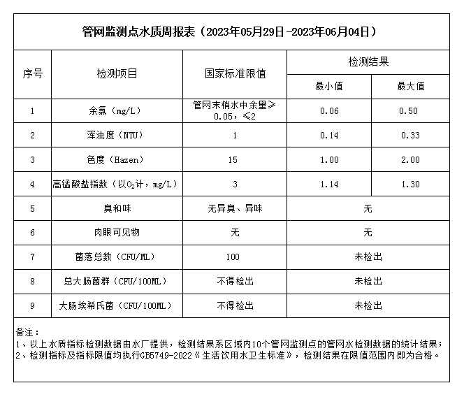 管網監(jiān)測點水質周報表(2023年05月29日-2023年06月04日)