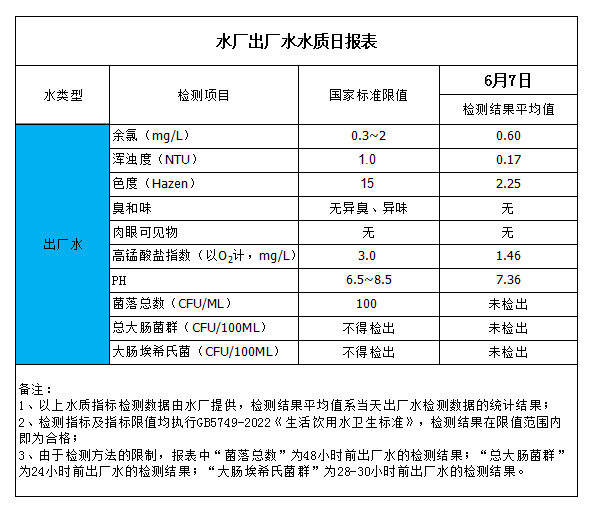 水廠出廠水水質(zhì)日報表(2023-6-7)