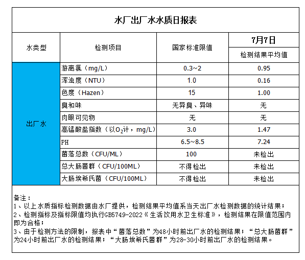 水廠出廠水水質日報表(2023-7-7)