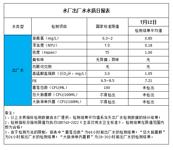 水廠出廠水水質(zhì)日報(bào)表(2023-7-12)