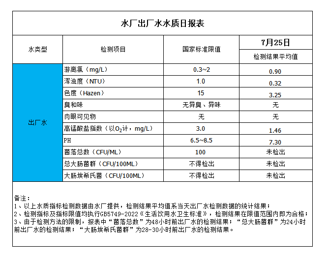 水廠出廠水水質(zhì)日報表(2023-7-25)