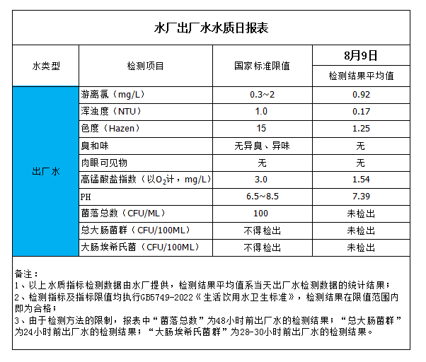 水廠出廠水水質(zhì)日報表(2023-8-9)